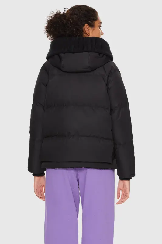 • The hood is equipped with a stand collar and lined with cozy fleece, offering additional protection against the elements. The knit brim of the hood can be folded downwards, creating a versatile and trendy look.