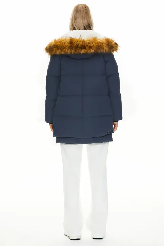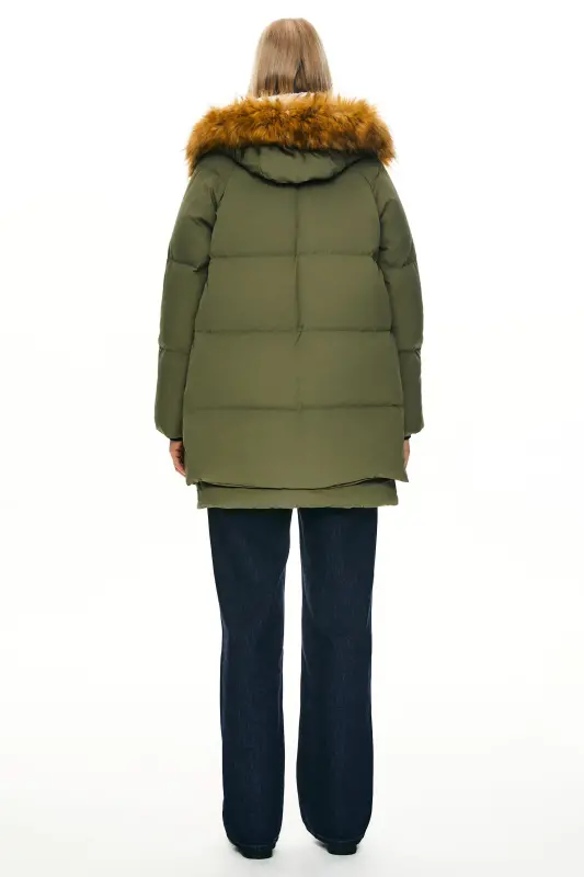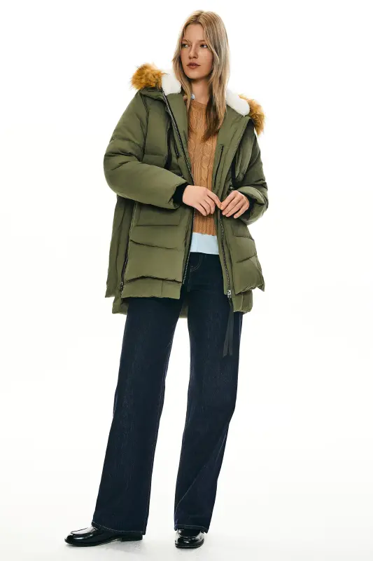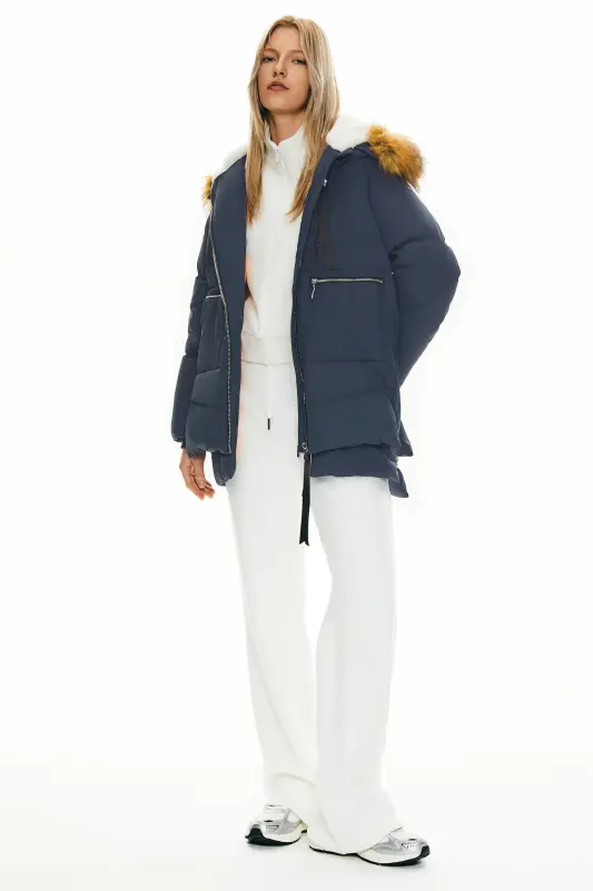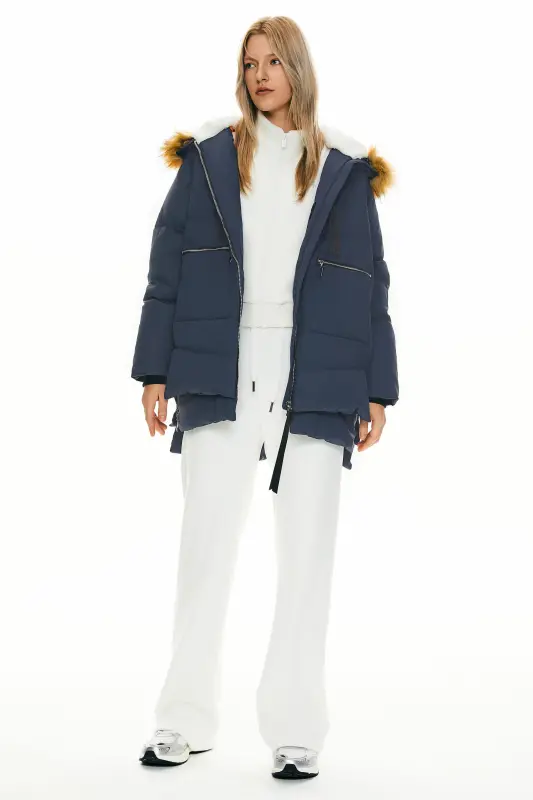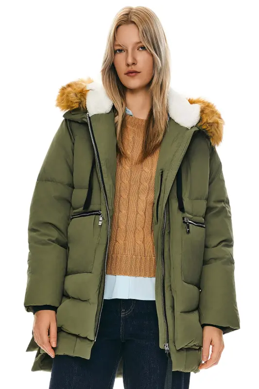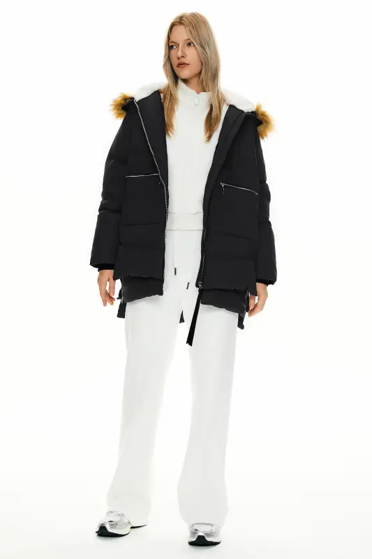 - This 092 Classics Thickened Down Jacket with Faux Fur Hood features a new faux fur collar and unique crumples at the bottom, combining warmth and fashion.