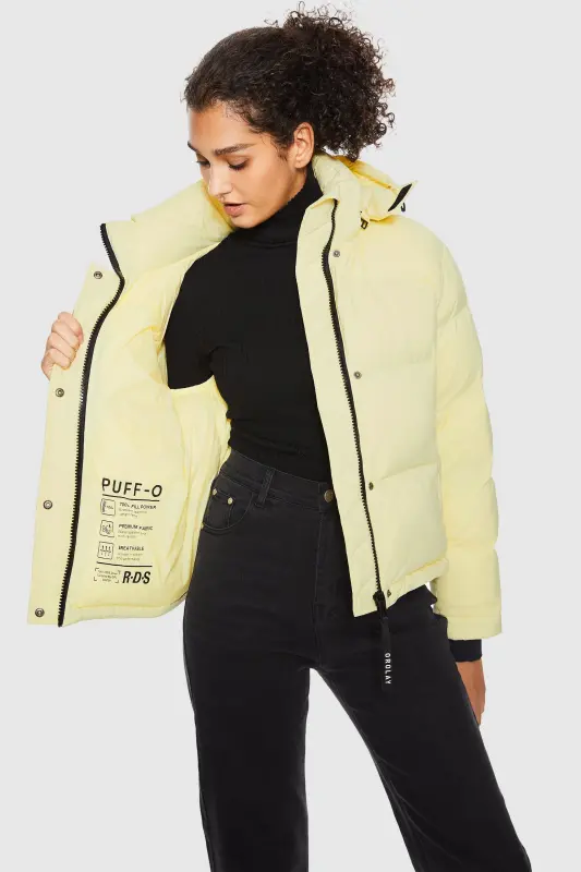 - It features a zipper and snap double closure with a double placket, ensuring maximum protection against the cold. The back hem of the down jacket is gracefully curved, creating a fashionable and flattering look.