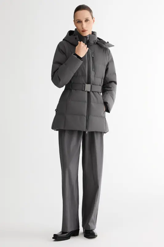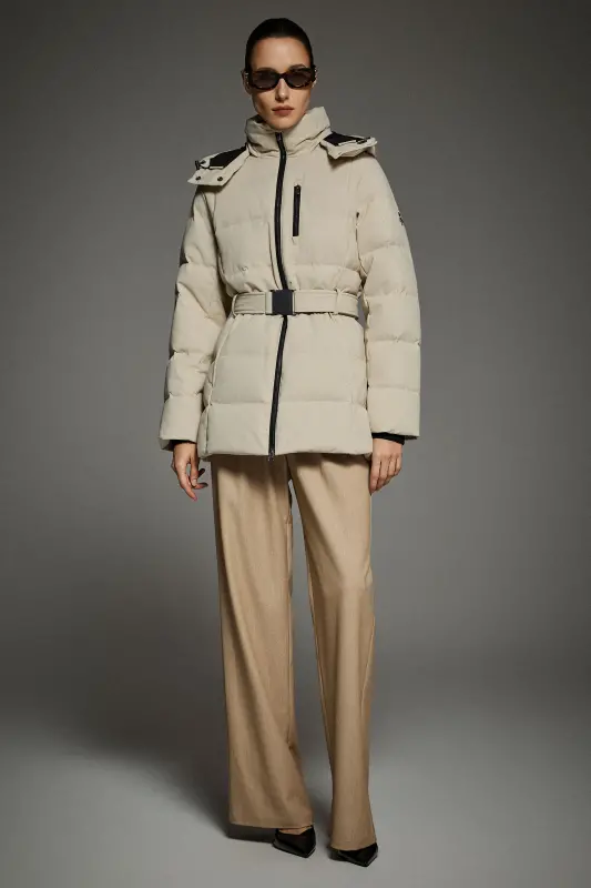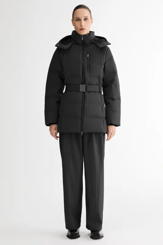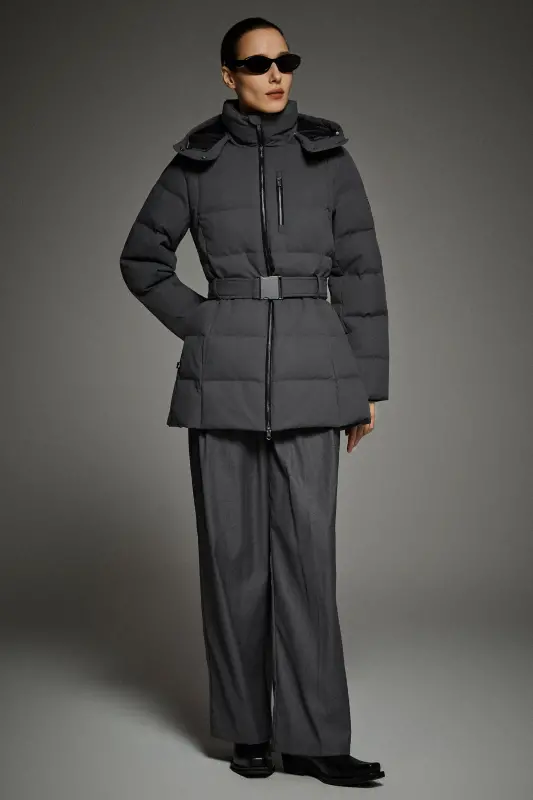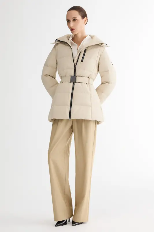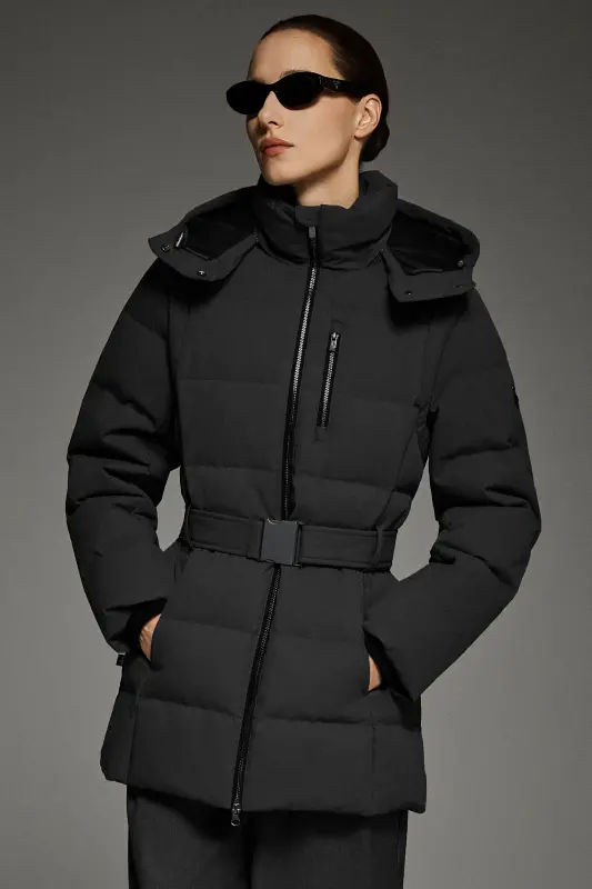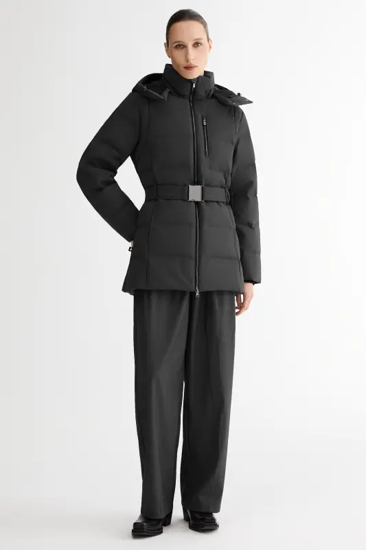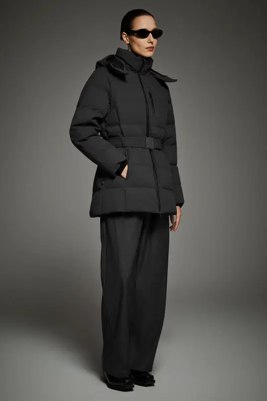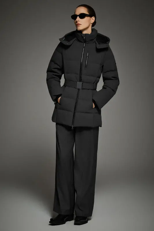 - Mid-Length Structured Down Jacket with Detachable Hood:A high-end down coat designed in a crisp, structured silhouette with a detachable hood and a flattering mid-length cut—perfect for elevated everyday wear.