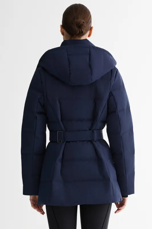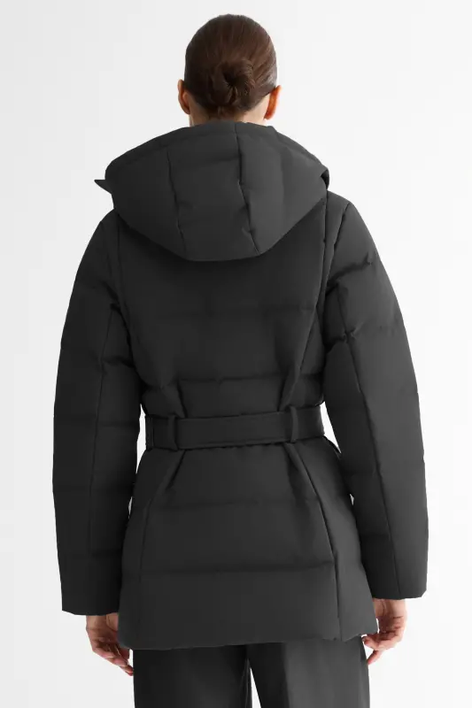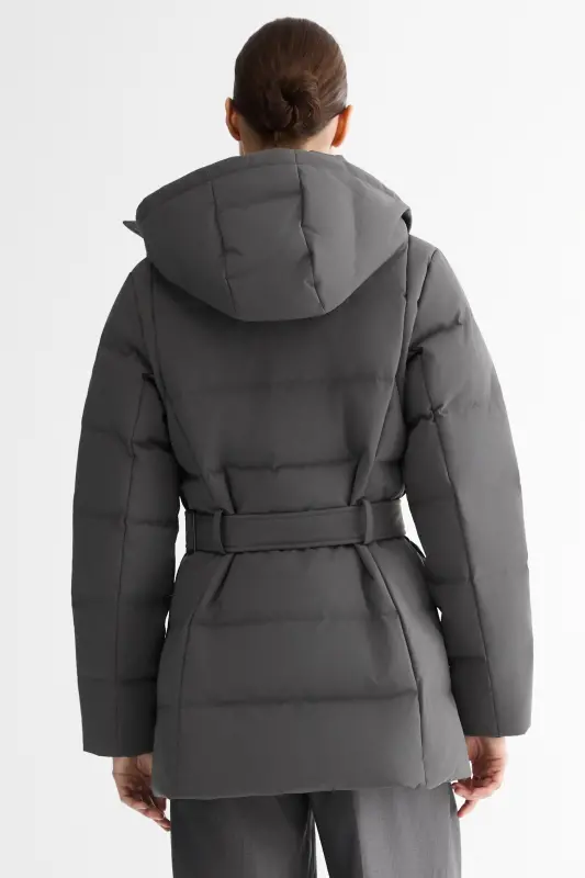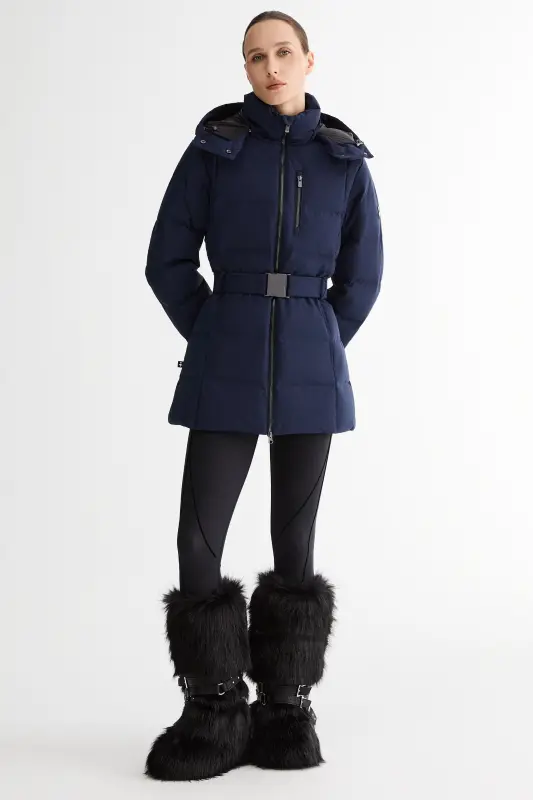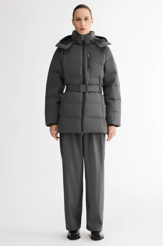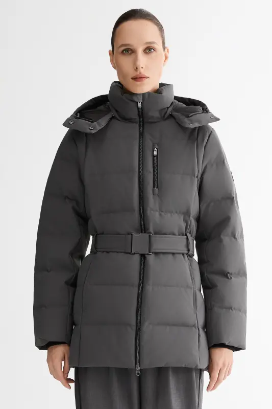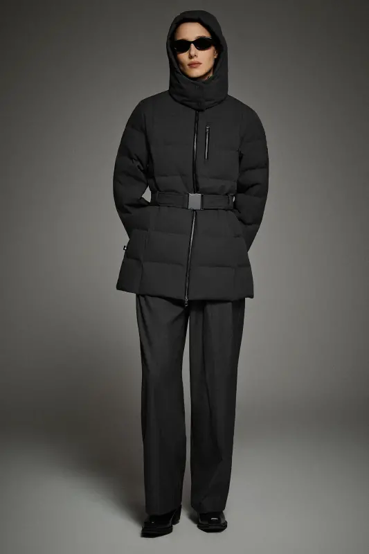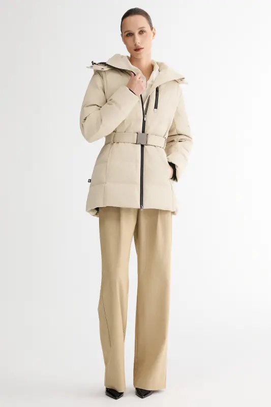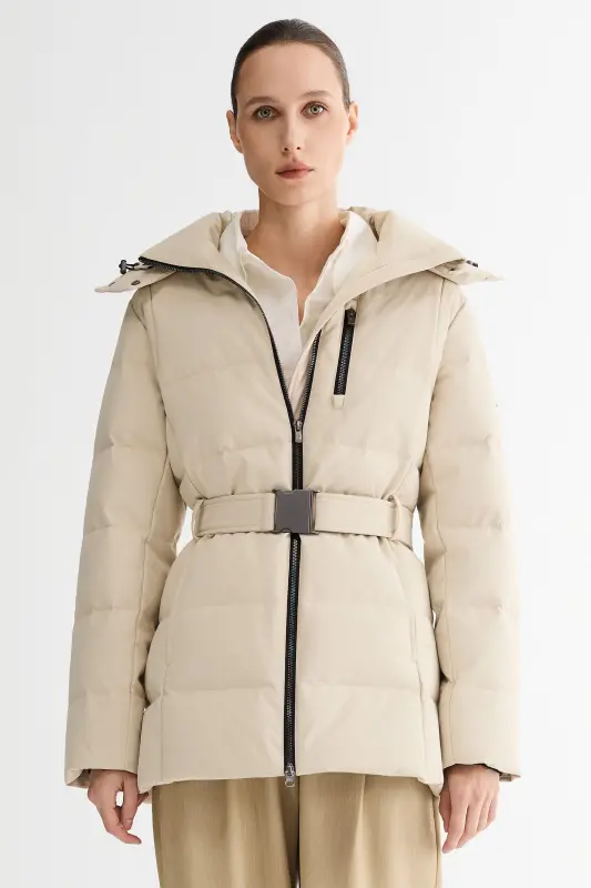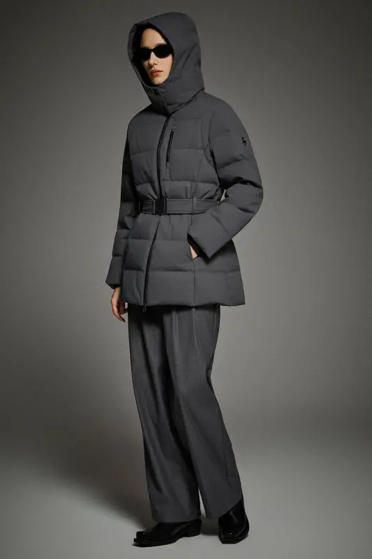 - Mid-Length Structured Down Jacket with Detachable Hood:A high-end down coat designed in a crisp, structured silhouette with a detachable hood and a flattering mid-length cut—perfect for elevated everyday wear.