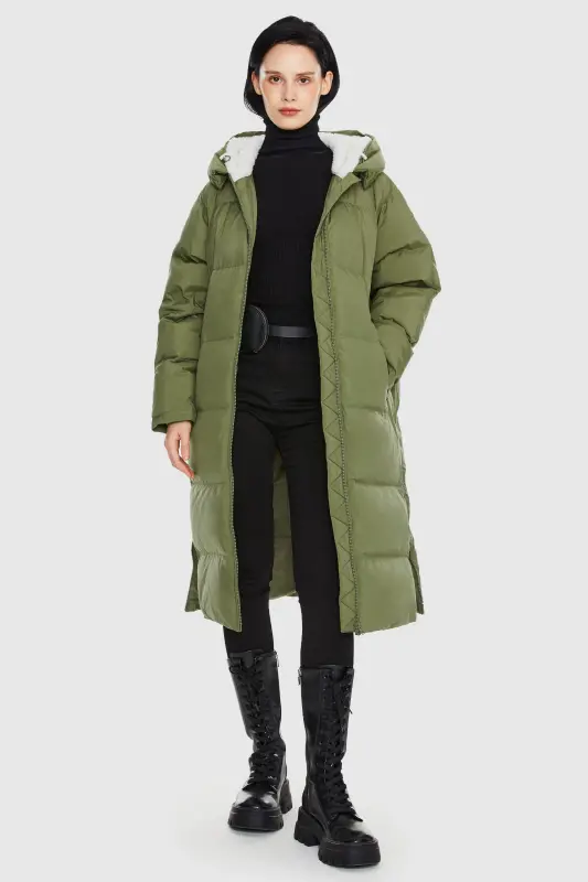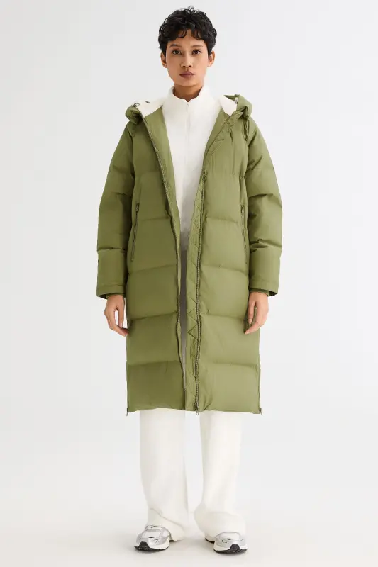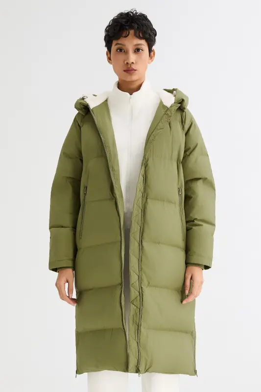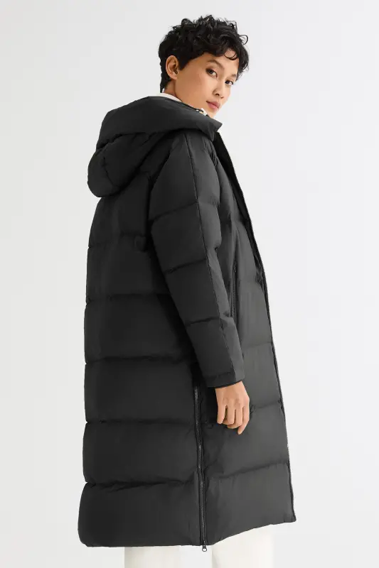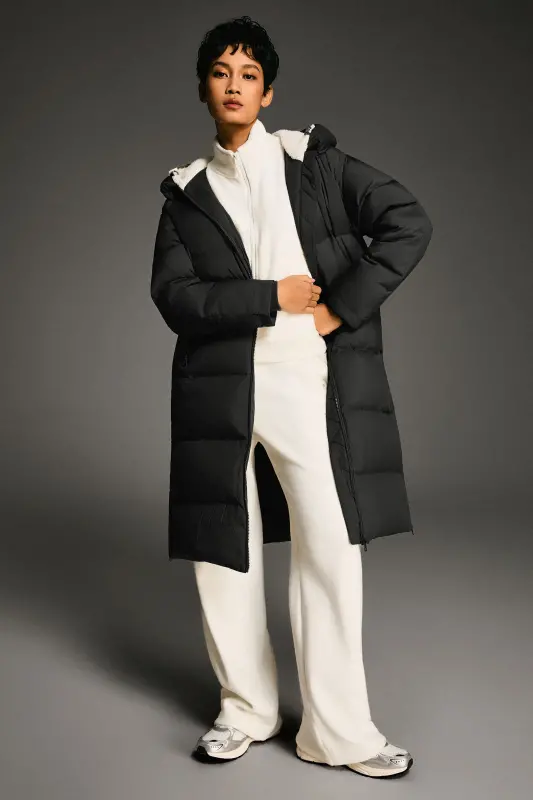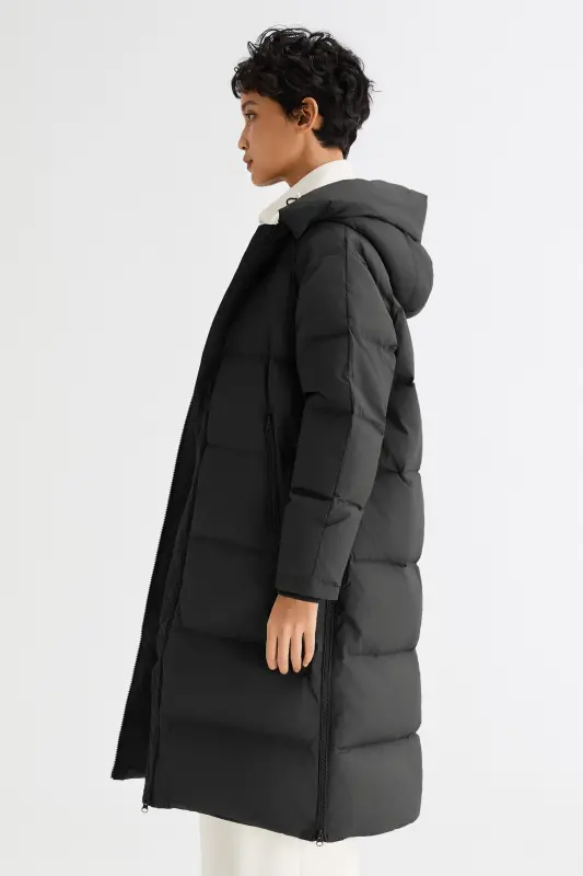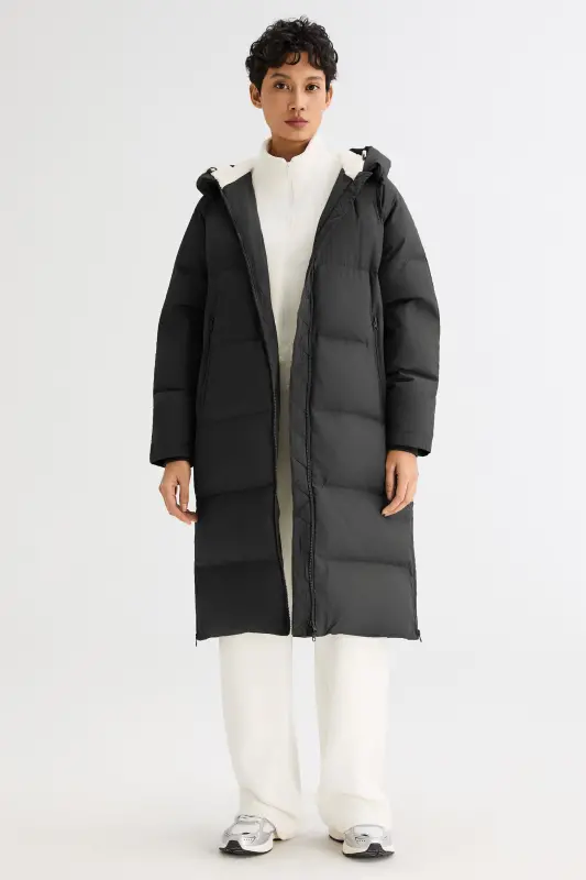 - Our long down jacket is filled with 90% high-quality duck down that provides exceptional warmth in cold weather. The down filling is lightweight and helps keep the jacket slim fitting yet warm.