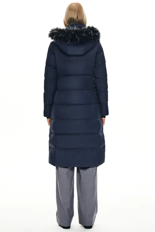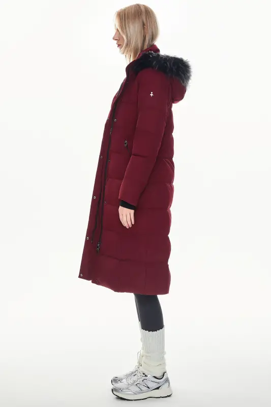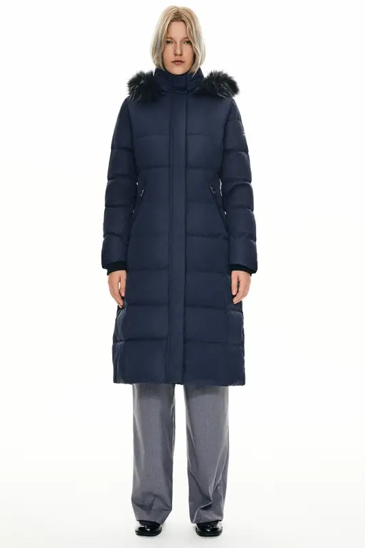 - Long hooded puffer coat with concealed zip-and-snap placket, 2 side-entry zip pockets, removable hood with faux fur trim.