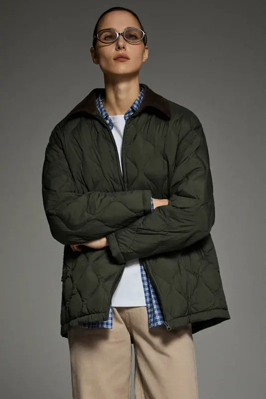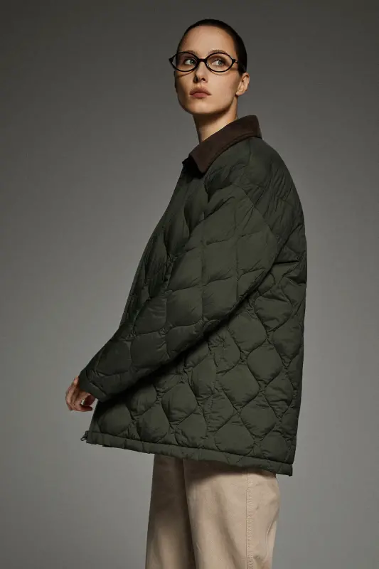 - Luxurious Feel: The plush, crinkled nylon fabric of this quilted puffer jacket feels luxurious against the skin, offering warmth without bulk for all-day coziness.